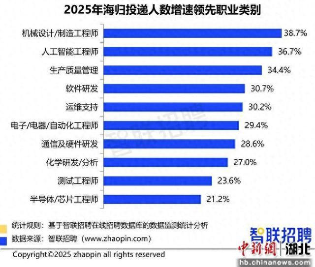 | 中新网湖北新闻1月28日电(白雪)智联招聘近日发布的《2025中国海归就业调查报告》显示,2025年应届留学生回国求职规模同比增长12%,创8年来新高,超八成留学生拥有硕士学位,专业分布与新质生产力发展需求高度契合,海归人才正加速向中国新质生产力核心领域集聚。 数据显示,2025年在国内求职的海归人数较2024年增长5%,为2018年的1.51倍;其中应届留学生回国求职人数同比增12%,达2018年的2.25倍。尽管2023年海归求职规模指数有所回调,但近两年持续回升,凸显留学人才回国发展的坚定趋势。 从专业分布来看,金融学、会计学等传统商科及社科专业仍居海归求职热门前列,而计算机科学与技术、人工智能、材料科学与工程等与新质生产力核心领域相关的专业,也悉数进入海归求职专业前20名,留学生专业选择与国内产业升级方向日趋契合。 行业投递数据更直观体现海归求职的转向,新材料、光电子、机器人领域的海归投递人数增速分别达87.3%、82.2%、74.3%,智能硬件、人工智能、航空航天研究与制造等领域也增长显著,这些研发投入高、技术门槛高、国际化程度高的新质生产力领域,正取代部分传统热门行业,成为海归求职的新选择。